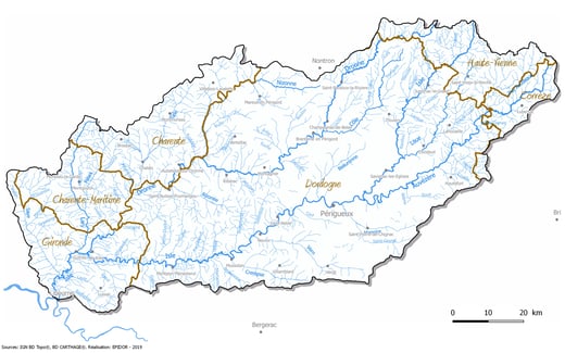 Le bassin Isle-Dronne s'étend sur 7 500 km², six départements et la région Nouvelle-Aquitaine.
